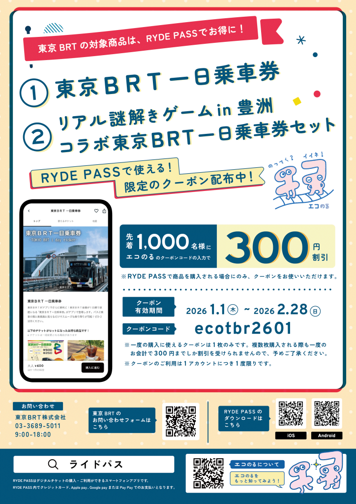 この度、RYDE PASSサイトで販売中の東京BRT一日乗車券が300円割引となるクーポンが配布されます